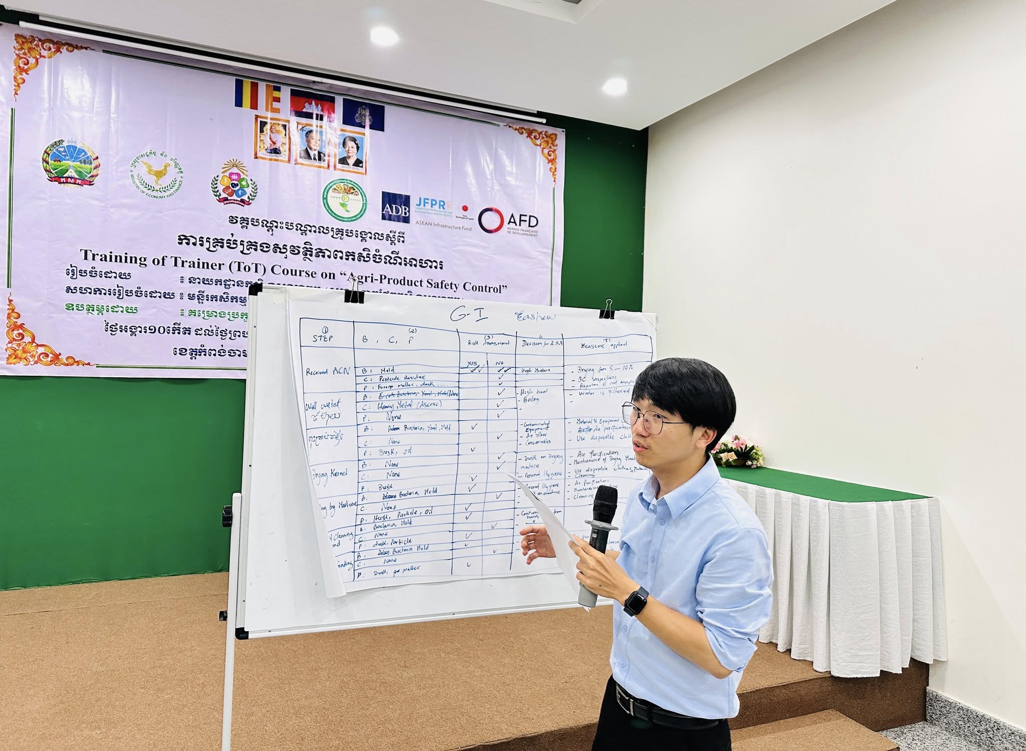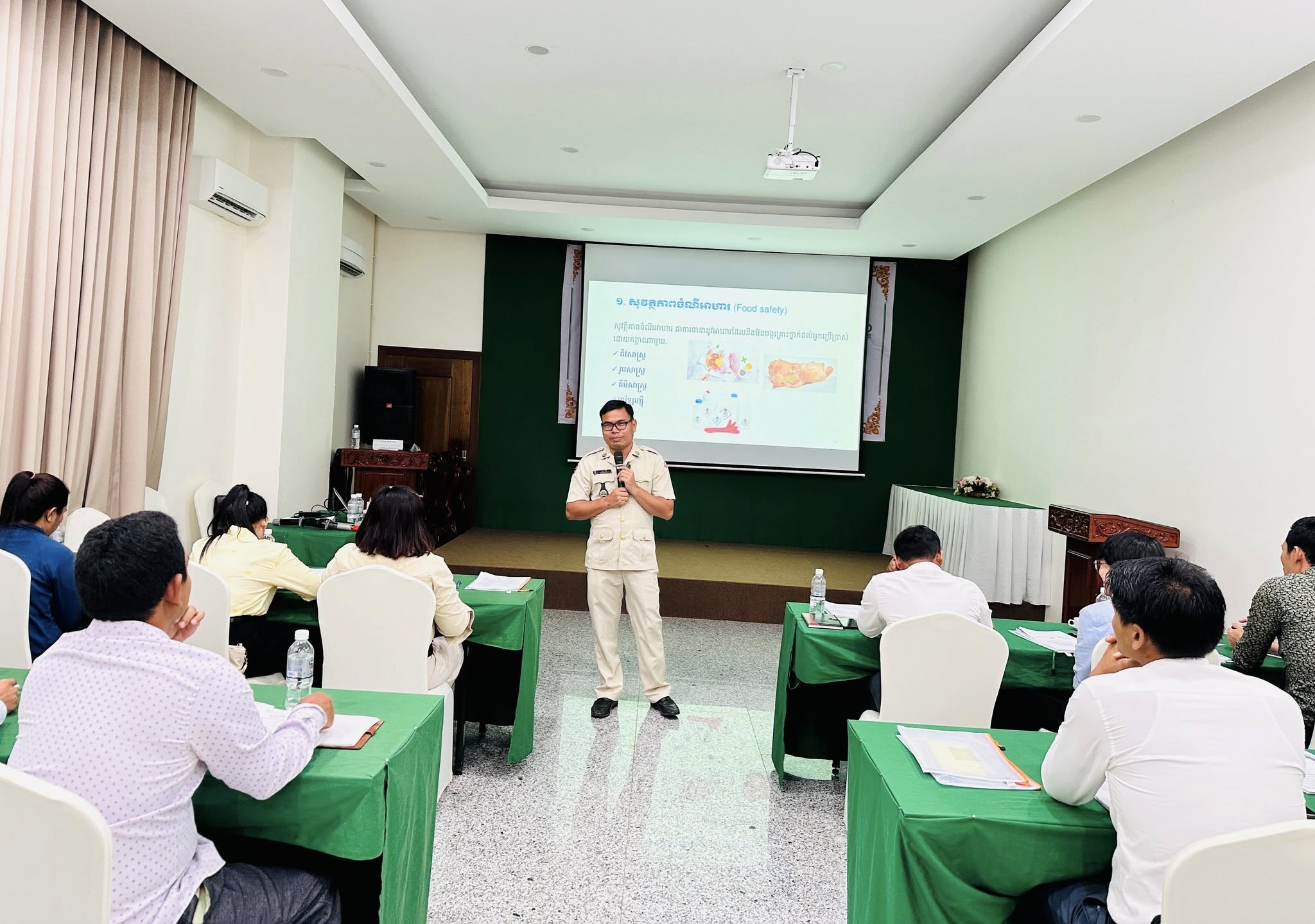 វគ្គបណ្តុះបណ្តាលមានការអញ្ជើញចូលរួមពីមន្រ្តីគម្រោងថ្នាក់ខេត្តកំពង់ចាម និងខេត្តត្បូងឃ្មុំ ព្រមទាំងមន្រ្តីជំនាញ ពាក់ព័ន្ធសរុបចំនួន ៣០រូប (ស្រ្តី ៧រូប)។ វគ្គបណ្តុះបណ្តាលនេះរៀបចំឡើងក្នុងគោលបំណង កសាងសមត្ថភាពដល់មន្រ្តីជំនាញលើការគ្រប់គ្រងសុវត្ថិភាពចំណីអាហារ ពាក់ព័ន្ធនឹងមូលដ្ឋានគ្រឹះ និងគោលការណ៍អនុវត្តប្រព័ន្ធគ្រប់គ្រងសុវត្ថិភាពចំណីអាហារ (GHP/GMP/HACCP) ដើម្បីមានលទ្ធភាពគ្រប់គ្រាន់ក្នុងការផ្តល់ការប្រឹក្សាយោបល់ និងតាមដានសកម្មភាពជាមួយសហគ្រាសកសិកម្មដែលបានជ្រើសរើសក្នុងគម្រោង លើការរៀបចំផែនការអនុវត្តនិងការស្នើនូវវិញ្ញាបនបត្រគ្រប់គ្រងគុណភាពសុវត្ថិភាពចំណីអាហារ (GHP/GMP/HACCP) ស្របតាមសូចនាករដែលបានកំណត់នៅក្នុងក្របខណ្ឌគម្រោង ACSEP។