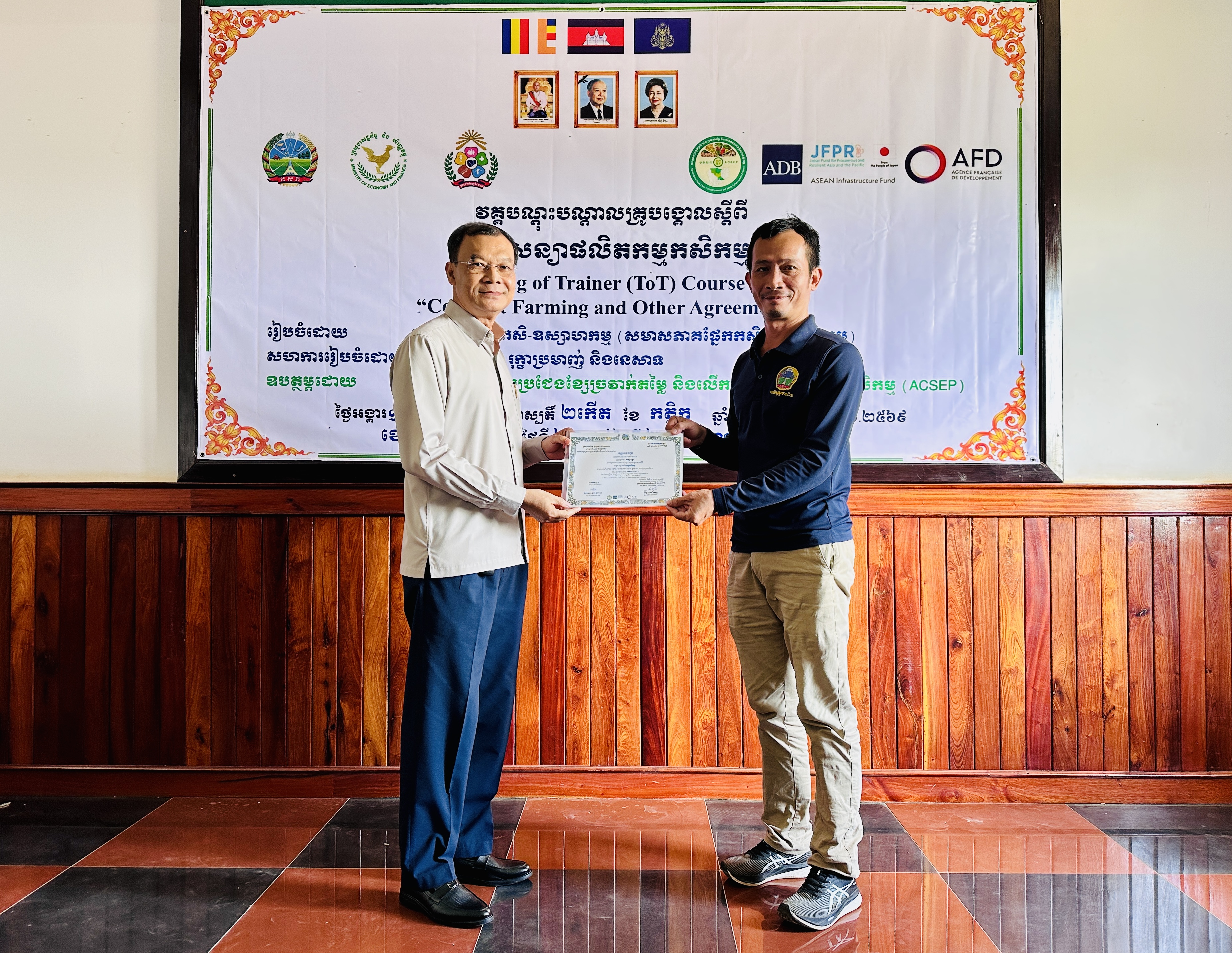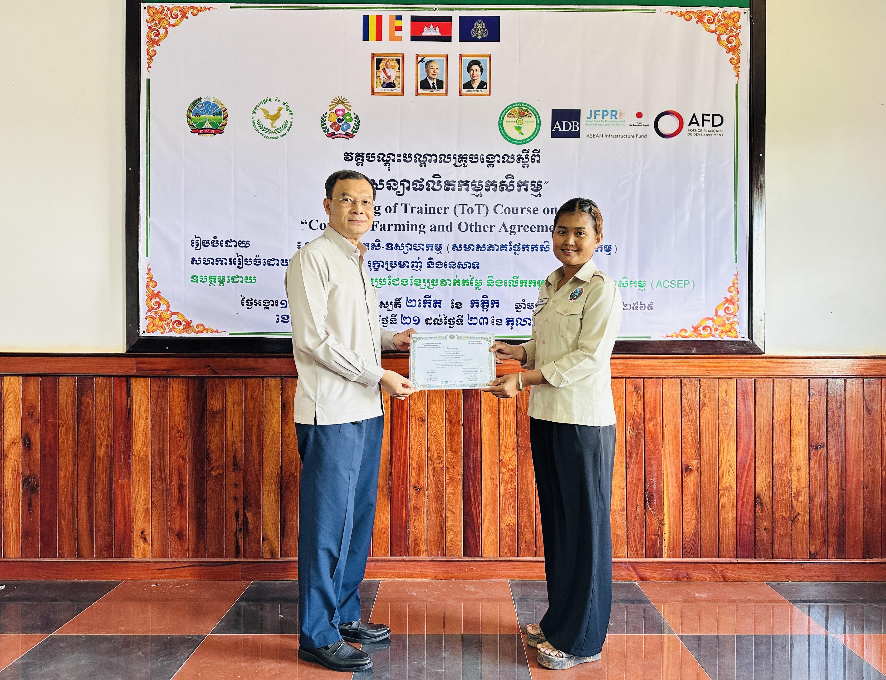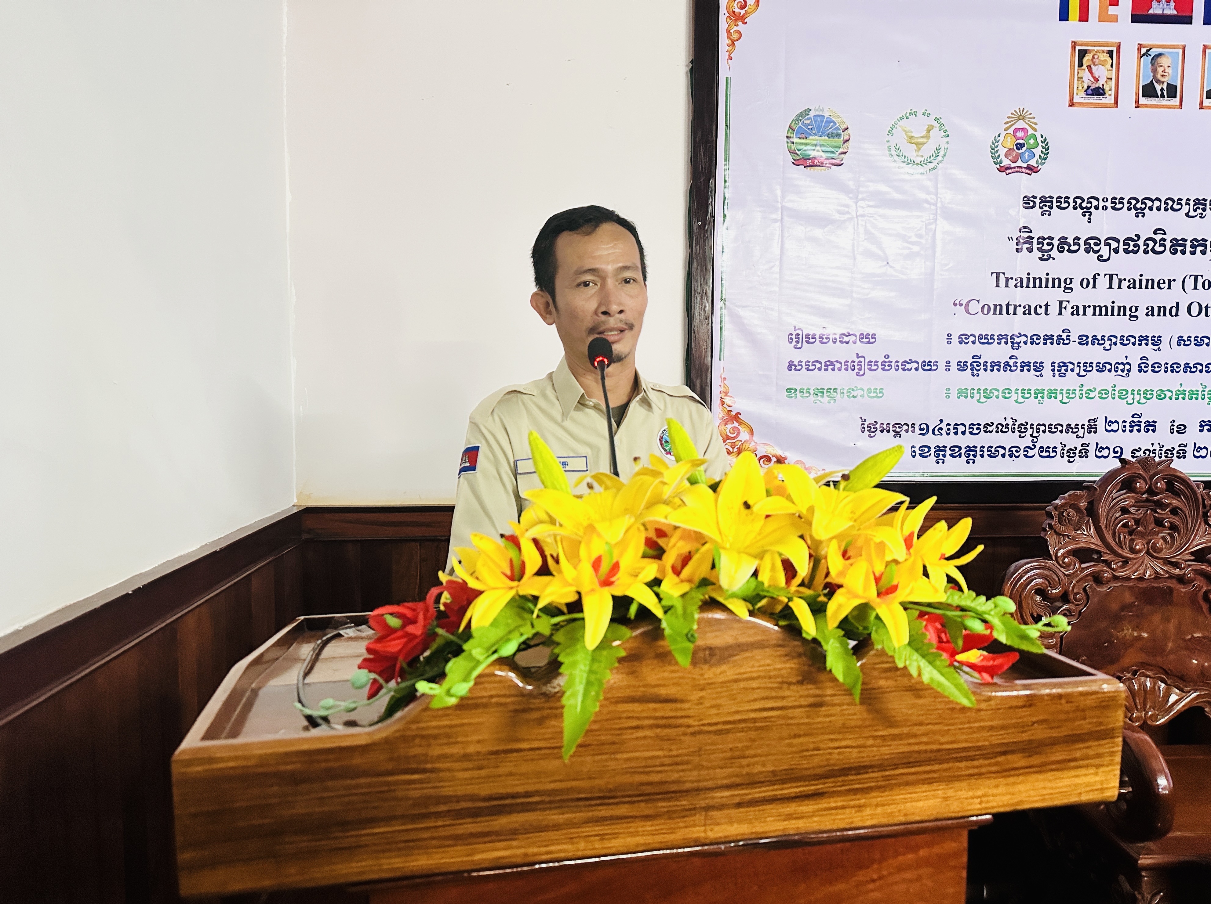 នៅថ្ងៃអង្គារ ១៤រោច ដល់ថ្ងៃព្រហស្បត្តិ៍ ២កើត ខែកក្តិត ឆ្នាំម្សាញ់ សប្តស័ក ព.ស.២៥៦៩ ត្រូវនឹងថ្ងៃទី២១ ដល់ថ្ងៃទី២៣ខែតុលា ឆ្នាំ២០២៥ នៅទីរួមខេត្តឧត្តរមានជ័យ នាយកដ្ឋានកសិ-ឧស្សាហកម្ម ដែលជាអង្គភាពអនុវត្តគម្រោងនៃសមាសភាគផ្នែកកសិ-ឧស្សាហកម្មនៃគម្រោងប្រកួតប្រជែងខ្សែច្រវាក់តម្លៃ និងលើកកម្ពស់សុវត្ថិភាពកសិកម្ម (ACSEP) ដោយសហការជាមួយមន្ទីរកសិកម្ម រុក្ខាប្រមាញ់ និងនេសាទខេត្តឧត្តរមានជ័យ និងខេត្តសៀមរាប អង្គភាពអនុវត្តគម្រោងថ្នាក់ខេត្ត បានរៀបចំវគ្គបណ្តុះបណ្តាលគ្រូបង្គោលស្តីពី "កិច្ចសន្យាផលិតកម្មកសិកម្ម" ក្រោមអធិបតីភាពបណ្ឌិត ហង់ សុវណ្ណ អនុប្រធាននាយកដ្ឋានកសិ-ឧស្សាហកម្ម និងជាប្រធានសមាសភាគផ្នែកកសិ-ឧស្សាហកម្ម ដោយមានការអញ្ជើញចូលរួមពីមន្រ្តីគម្រោង ACSEP មន្រ្តីជំនាញពាក់ព័ន្ធថ្នាក់ខេត្ត ព្រមទាំងគ្រូឧទ្ទេស សរុបចំនួន ៣០រូប (ស្រ្តី ៩រូប)។