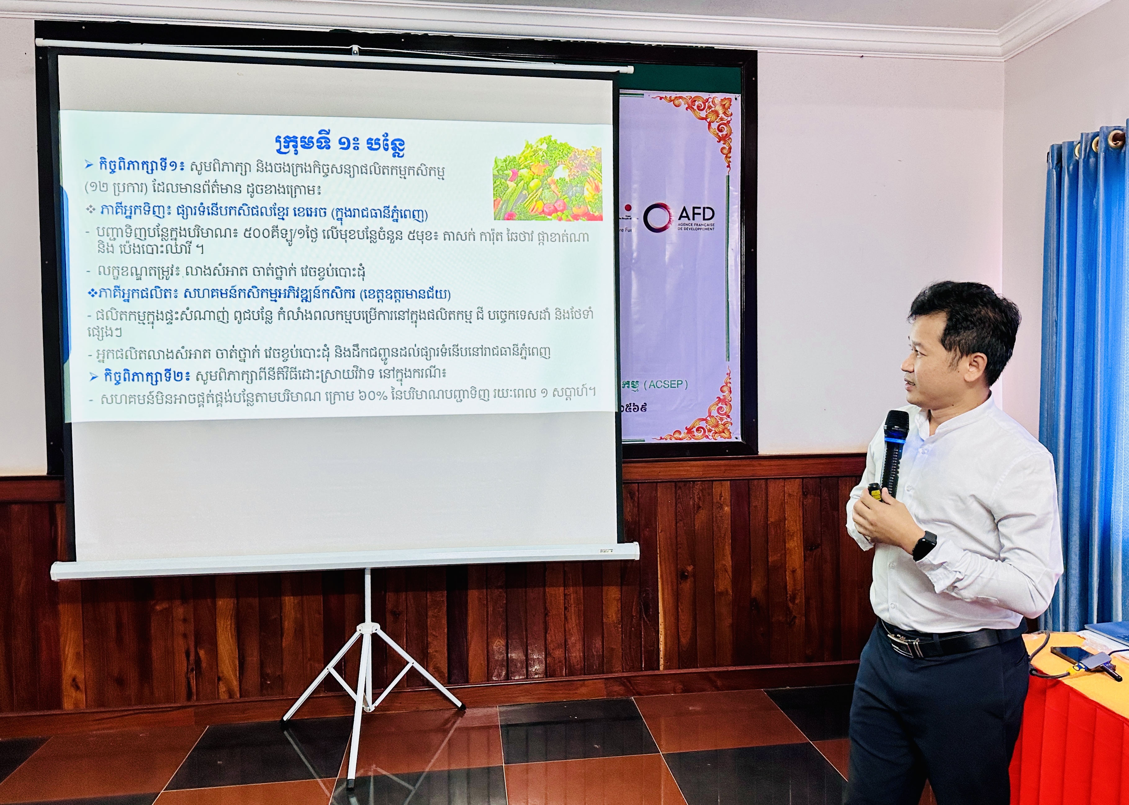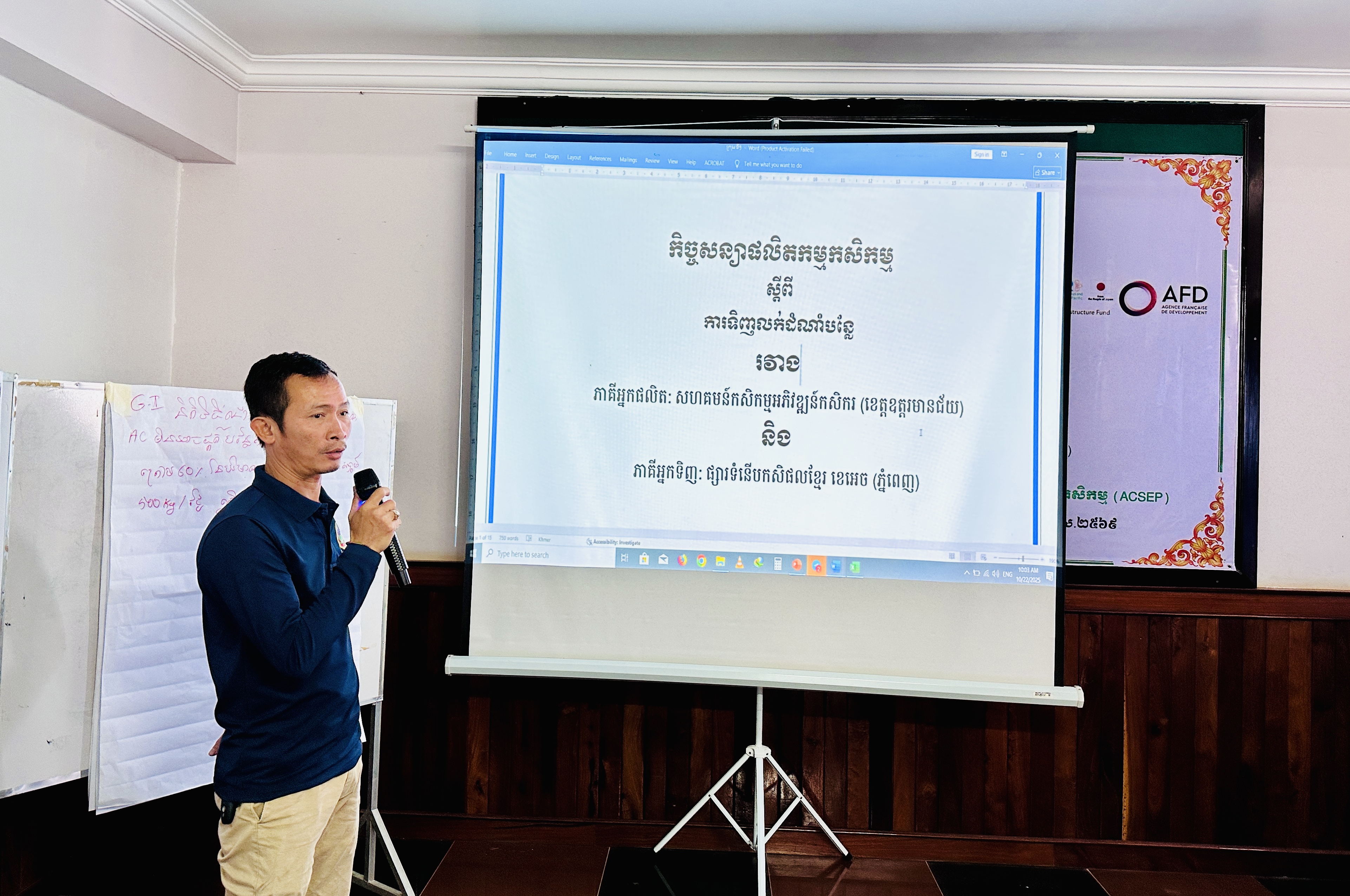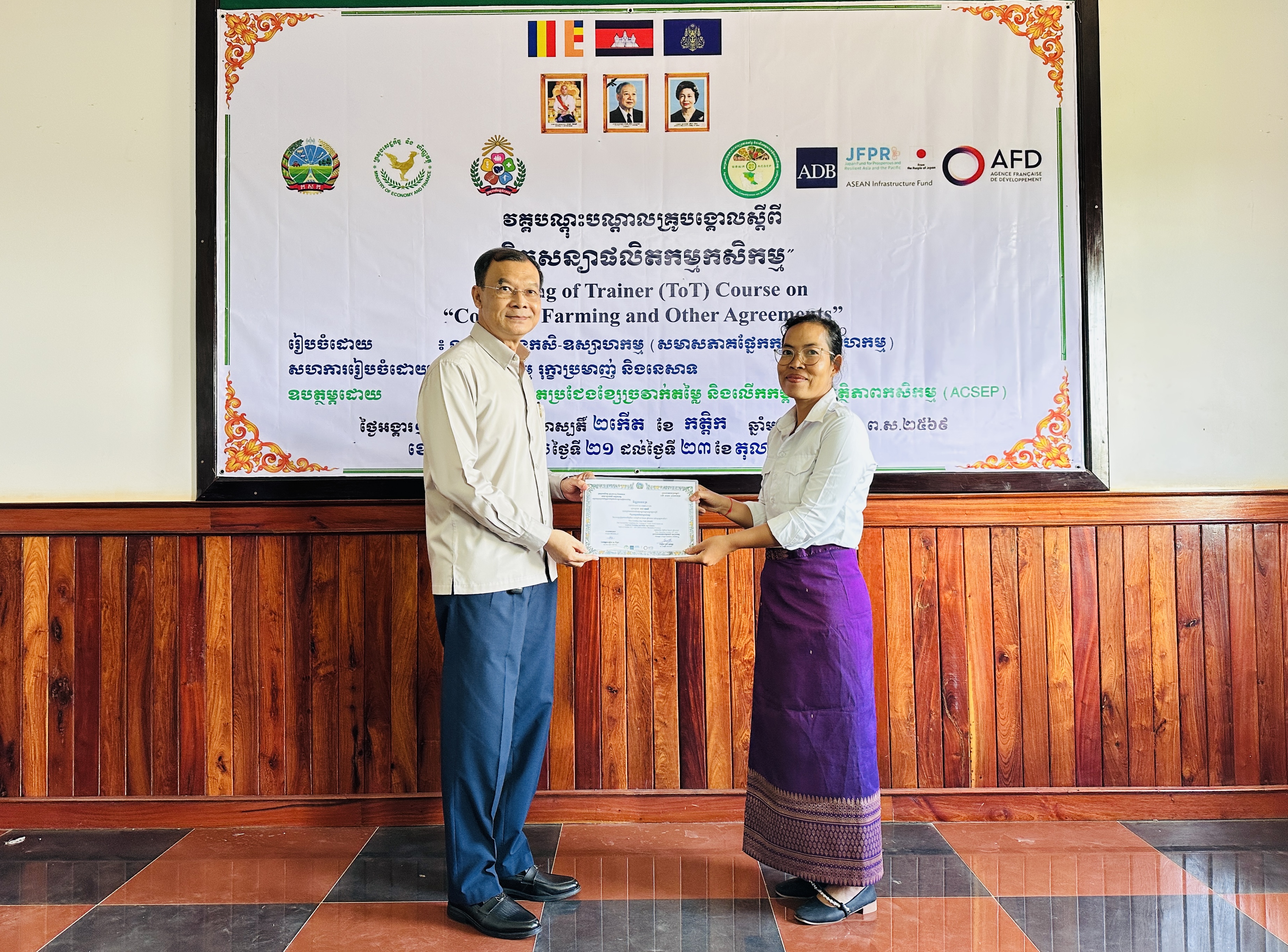 នៅថ្ងៃអង្គារ ១៤រោច ដល់ថ្ងៃព្រហស្បត្តិ៍ ២កើត ខែកក្តិត ឆ្នាំម្សាញ់ សប្តស័ក ព.ស.២៥៦៩ ត្រូវនឹងថ្ងៃទី២១ ដល់ថ្ងៃទី២៣ខែតុលា ឆ្នាំ២០២៥ នៅទីរួមខេត្តឧត្តរមានជ័យ នាយកដ្ឋានកសិ-ឧស្សាហកម្ម ដែលជាអង្គភាពអនុវត្តគម្រោងនៃសមាសភាគផ្នែកកសិ-ឧស្សាហកម្មនៃគម្រោងប្រកួតប្រជែងខ្សែច្រវាក់តម្លៃ និងលើកកម្ពស់សុវត្ថិភាពកសិកម្ម (ACSEP) ដោយសហការជាមួយមន្ទីរកសិកម្ម រុក្ខាប្រមាញ់ និងនេសាទខេត្តឧត្តរមានជ័យ និងខេត្តសៀមរាប អង្គភាពអនុវត្តគម្រោងថ្នាក់ខេត្ត បានរៀបចំវគ្គបណ្តុះបណ្តាលគ្រូបង្គោលស្តីពី "កិច្ចសន្យាផលិតកម្មកសិកម្ម" ក្រោមអធិបតីភាពបណ្ឌិត ហង់ សុវណ្ណ អនុប្រធាននាយកដ្ឋានកសិ-ឧស្សាហកម្ម និងជាប្រធានសមាសភាគផ្នែកកសិ-ឧស្សាហកម្ម ដោយមានការអញ្ជើញចូលរួមពីមន្រ្តីគម្រោង ACSEP មន្រ្តីជំនាញពាក់ព័ន្ធថ្នាក់ខេត្ត ព្រមទាំងគ្រូឧទ្ទេស សរុបចំនួន ៣០រូប (ស្រ្តី ៩រូប)។