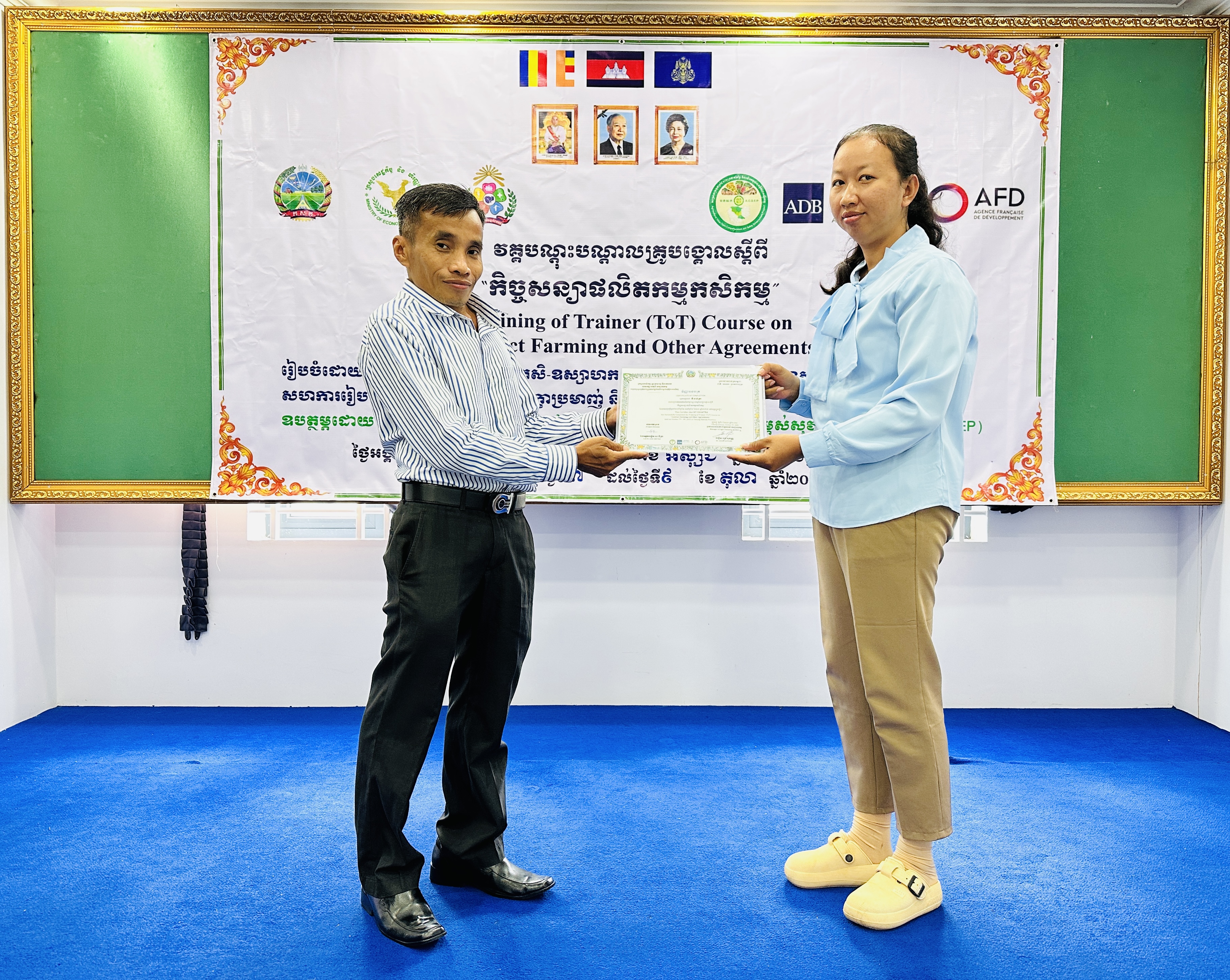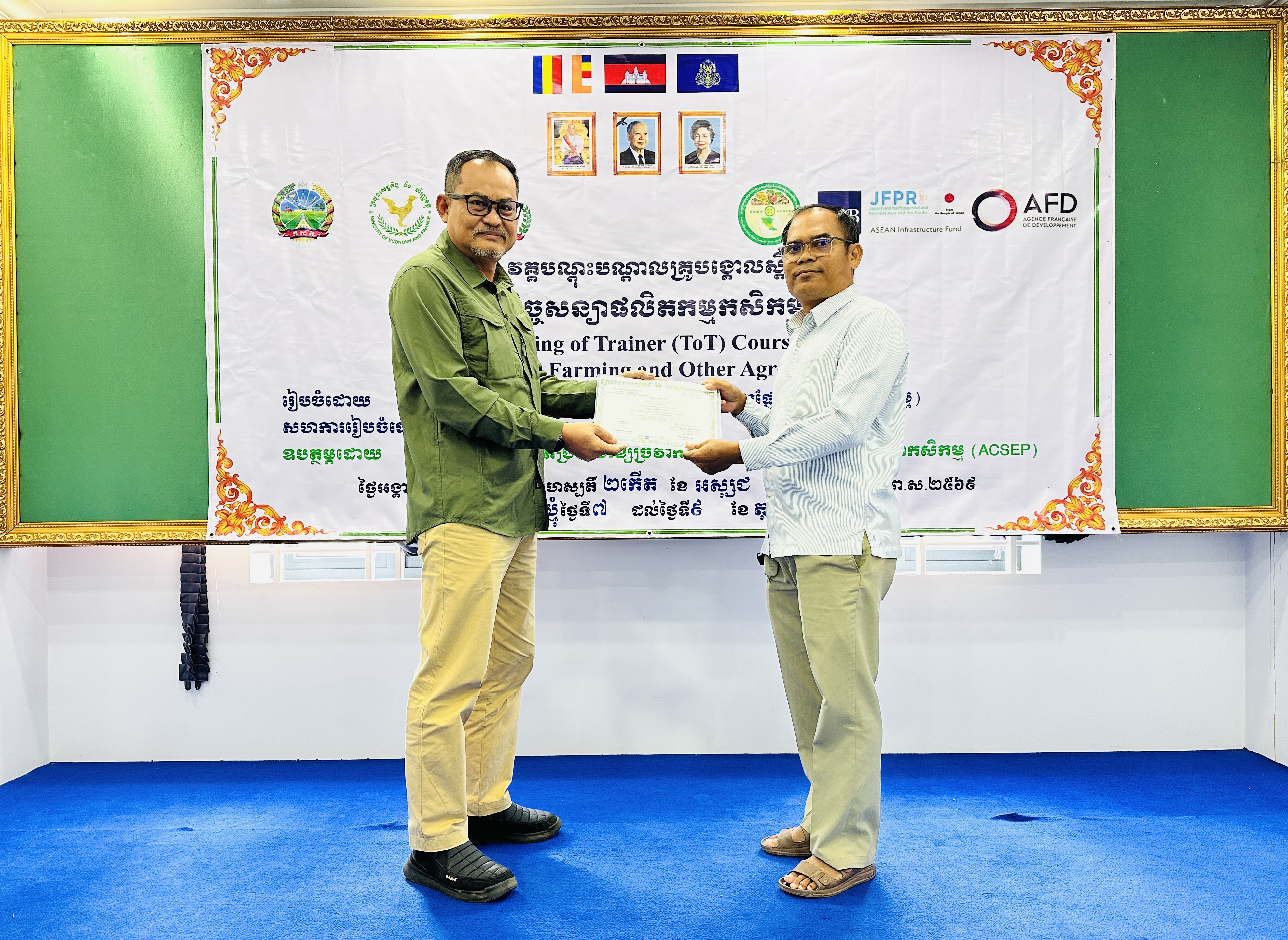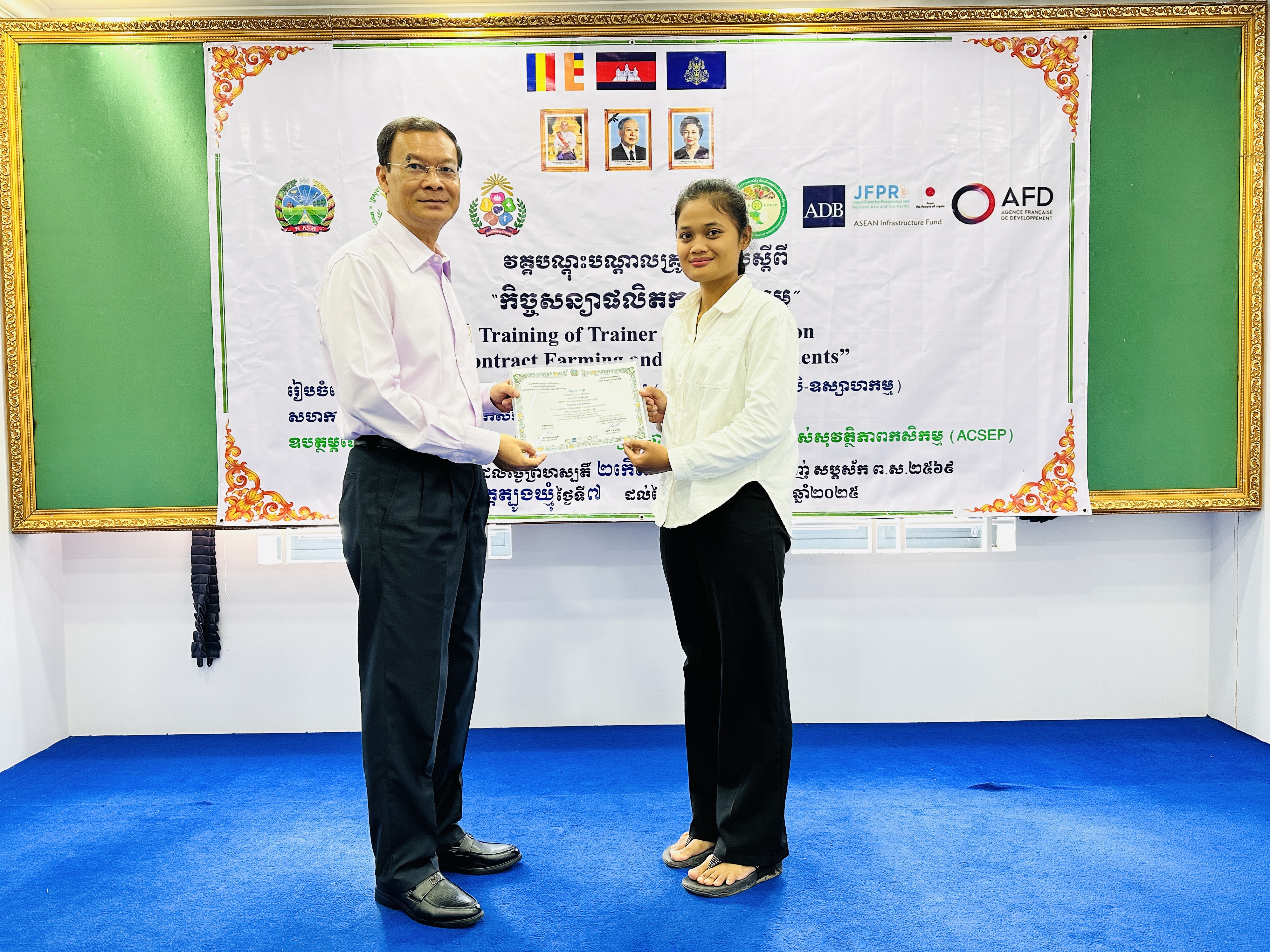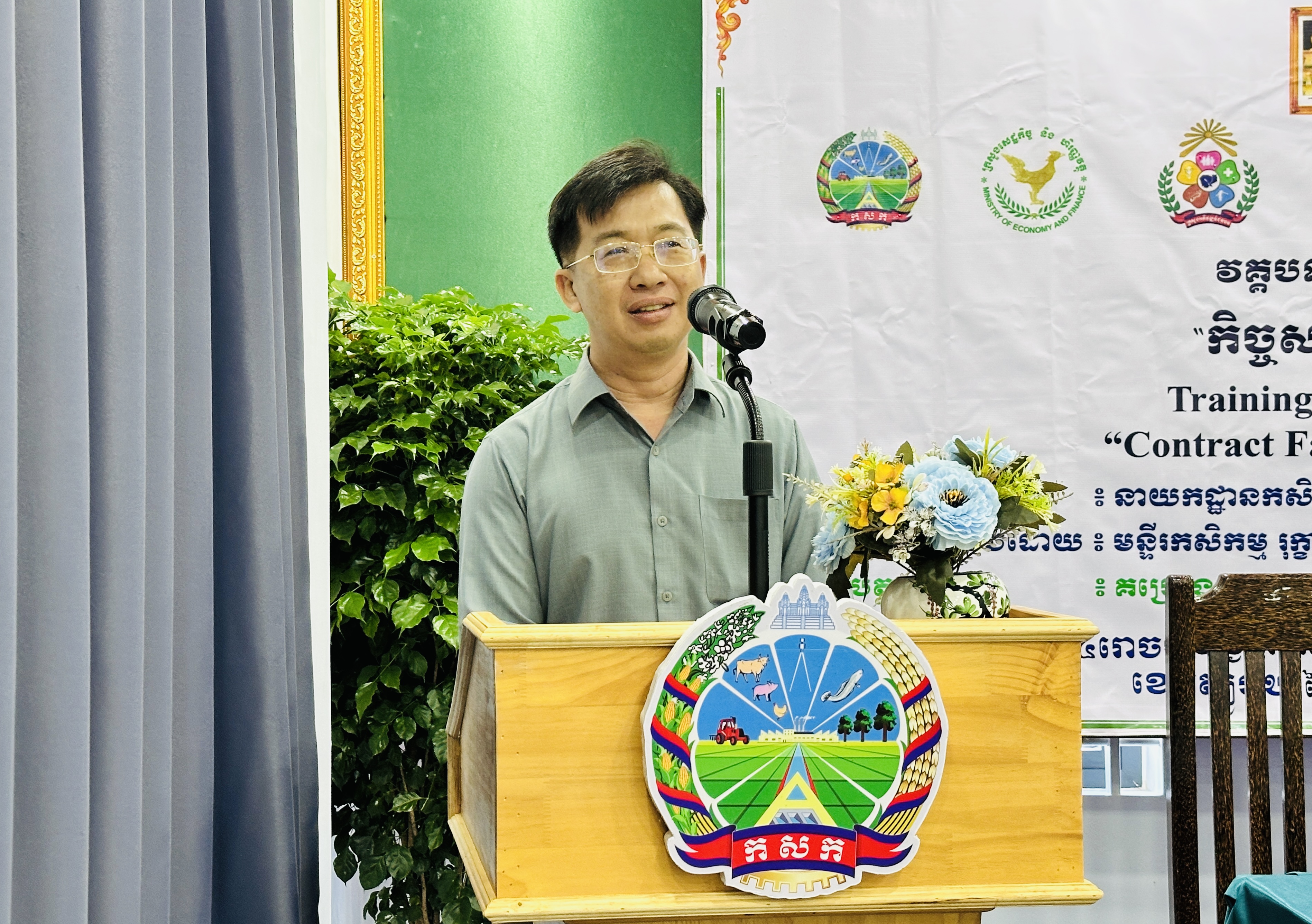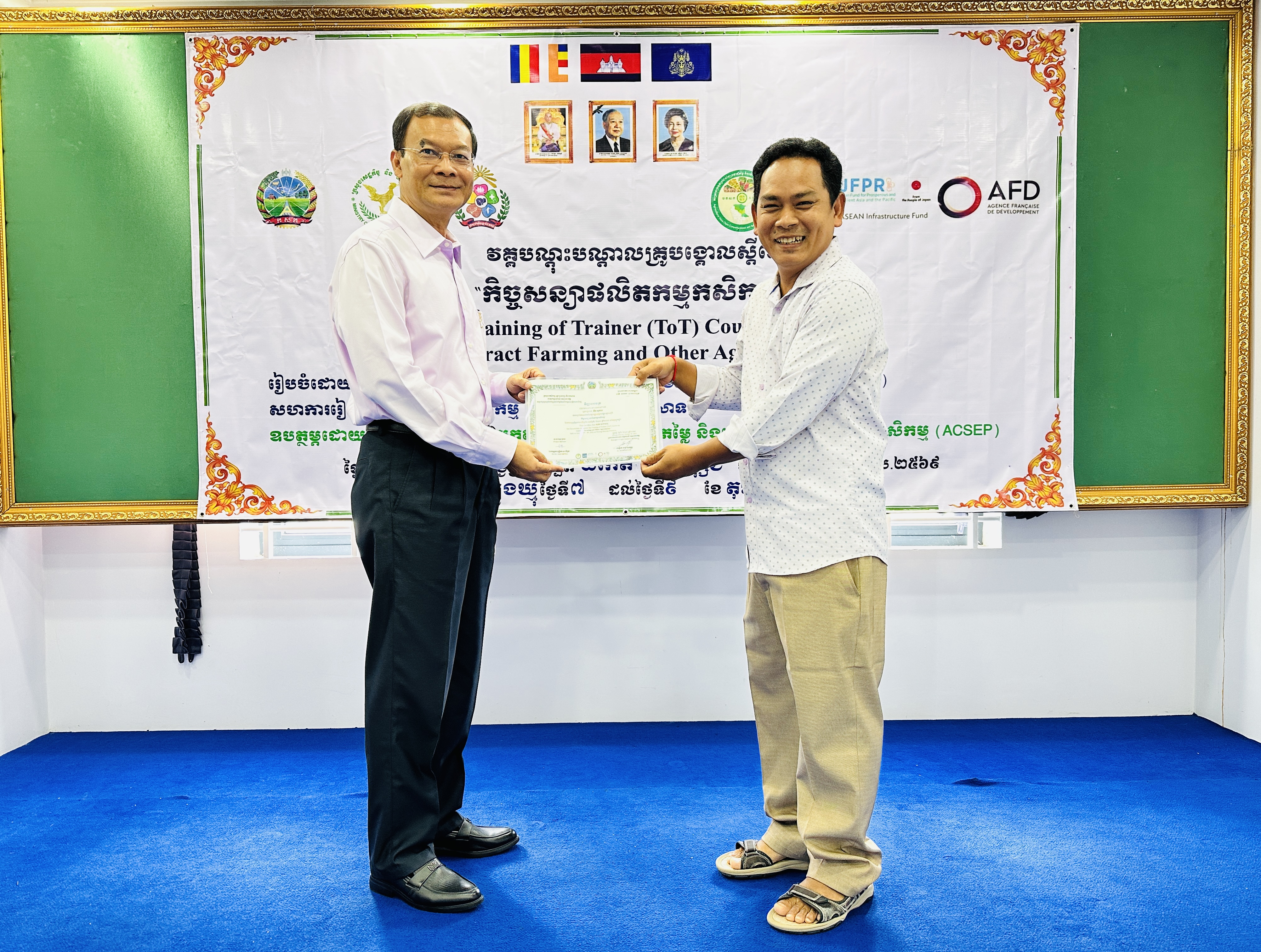 នៅថ្ងៃអង្គារ ១៥កើត ដល់ថ្ងៃព្រហស្បត្តិ៍ ២រោច ខែអស្សុជ ឆ្នាំម្សាញ់ សប្តស័ក ព.ស.២៥៦៩ ត្រូវនឹងថ្ងៃទី៧ ដល់ថ្ងៃទី៩ ខែតុលា ឆ្នាំ២០២៥ នៅទីរួមខេត្តត្បូងឃ្មុំ នាយកដ្ឋានកសិ-ឧស្សាហកម្ម ដែលជាអង្គភាពអនុវត្តគម្រោងនៃសមាសភាគផ្នែកកសិ-ឧស្សាហកម្មនៃគម្រោងប្រកួតប្រជែងខ្សែច្រវាក់តម្លៃ និងលើកកម្ពស់សុវត្ថិភាពកសិកម្ម (ACSEP) ដោយសហការជាមួយមន្ទីរកសិកម្ម រុក្ខាប្រមាញ់ និងនេសាទខេត្តត្បូងឃ្មុំ និងខេត្តកំពង់ចាម អង្គភាពអនុវត្តគម្រោងថ្នាក់ខេត្ត បានរៀបចំវគ្គបណ្តុះបណ្តាលគ្រូបង្គោលស្តីពី "កិច្ចសន្យាផលិតកម្មកសិកម្ម" ក្រោមអធិបតីភាពបណ្ឌិត ហង់ សុវណ្ណ អនុប្រធាននាយកដ្ឋានកសិ-ឧស្សាហកម្ម និងជាប្រធានសមាសភាគផ្នែកកសិ-ឧស្សាហកម្ម ដោយមានការអញ្ជើញចូលរួមពីមន្រ្តីគម្រោង ACSEP មន្រ្តីជំនាញពាក់ព័ន្ធថ្នាក់ខេត្ត ព្រមទាំងគ្រូឧទ្ទេស និងទីប្រឹក្សាបច្ចេកទេសផ្នែកអភិវឌ្ឍន៍កសិកម្ម និងផលិតកម្មកសិកម្មតាមកិច្ចសន្យា សរុបចំនួន ៣០រូប (ស្រ្តី ១០រូប)។