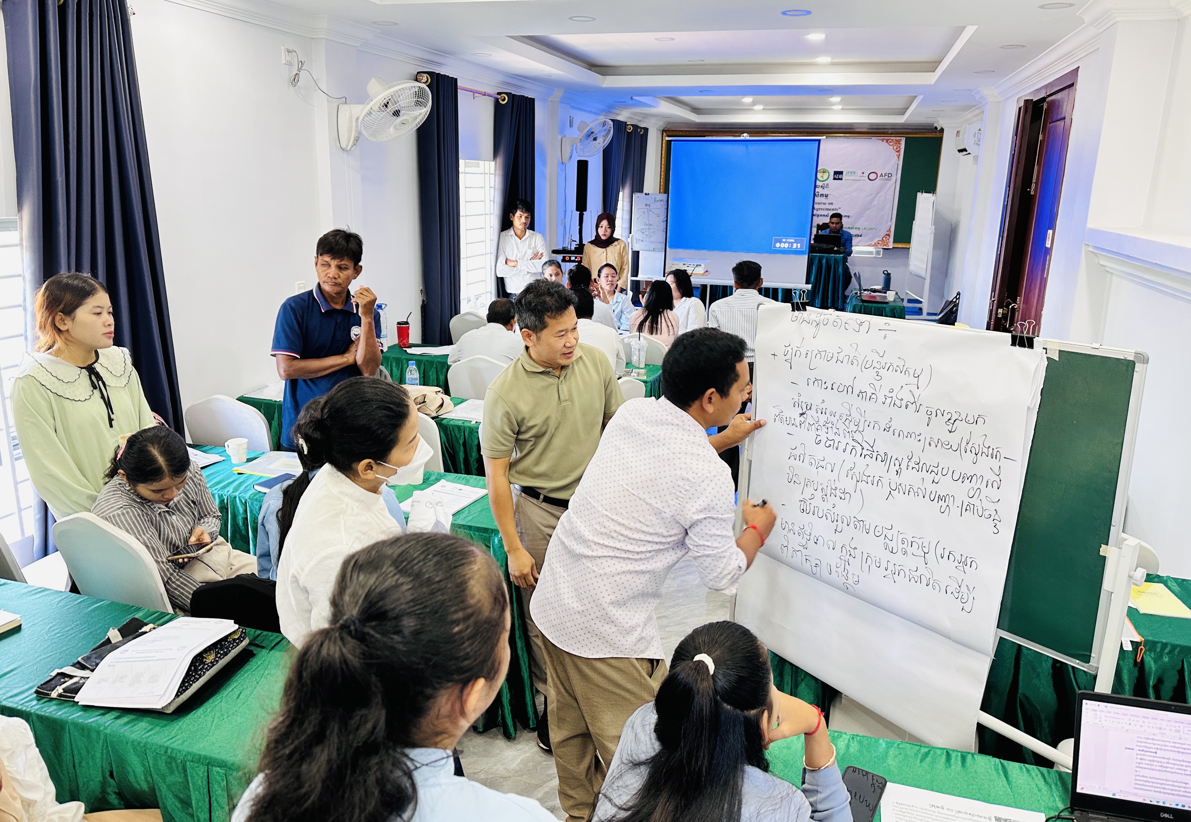ក្នុងដំណេីរការនៃវគ្គបណ្តុះបណ្តាល គ្រូឧទ្ទេស និងទីប្រឹក្សា AVCC បានធ្វើការវាយតម្លៃចំណេះដឹងសិក្ខាកាម តាមរយ:ការធ្វេីតេស្តសំណួរសាកល្បងមុនចាប់ផ្តើមវគ្គ និងក្រោយបញ្ចប់វគ្គ ហេីយបានរៀបចំការពិភាក្សតាមក្រុមចំពោះការរៀបចំកិច្ចសន្យាផលិតកម្មកសិកម្មលេីមុខដំណាំបន្លែ ស្វាយចន្ទី និងមាន់ស្រែ រួមទាំងនីតិវិធីក្នុងការដោះស្រាយវិវាទក្នុងកំឡុងពេលអនុវត្តកិច្ចសន្យា ដោយមានការចូលរួមផ្តល់មតិយោបល់លើការពិភាក្សាពីគ្រូបង្គោល ទីប្រឹក្សា AVCC និងក្រុមការងារ DAI ។